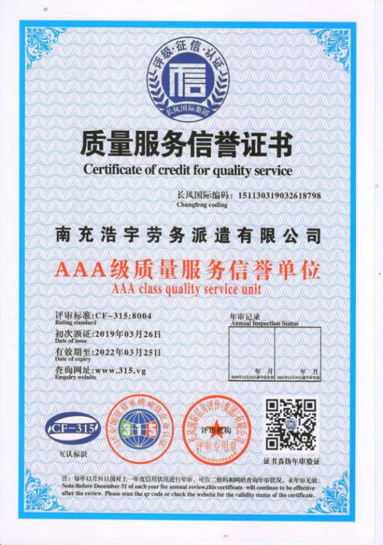 我公司榮獲質(zhì)量服務(wù)信譽(yù)證書(shū)AAA認(rèn)證
